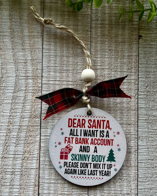 dear santa, all I want is a fat bank account and a skinny body please don't mix it up again like last year | christmas ornament