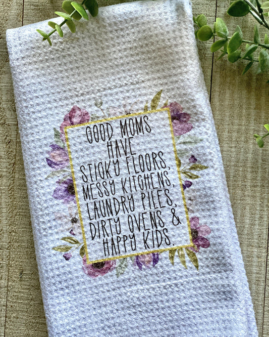 good moms have sticky floors, messy kitchens, laundry piles, dirty ovens & happy kids | kitchen towel