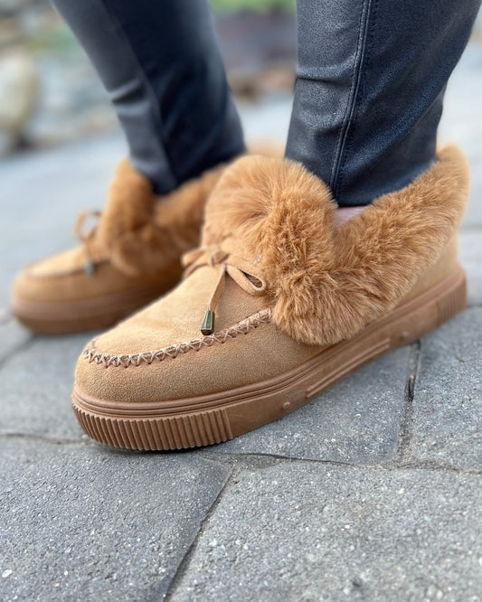 fur lined slip on shoes | tan