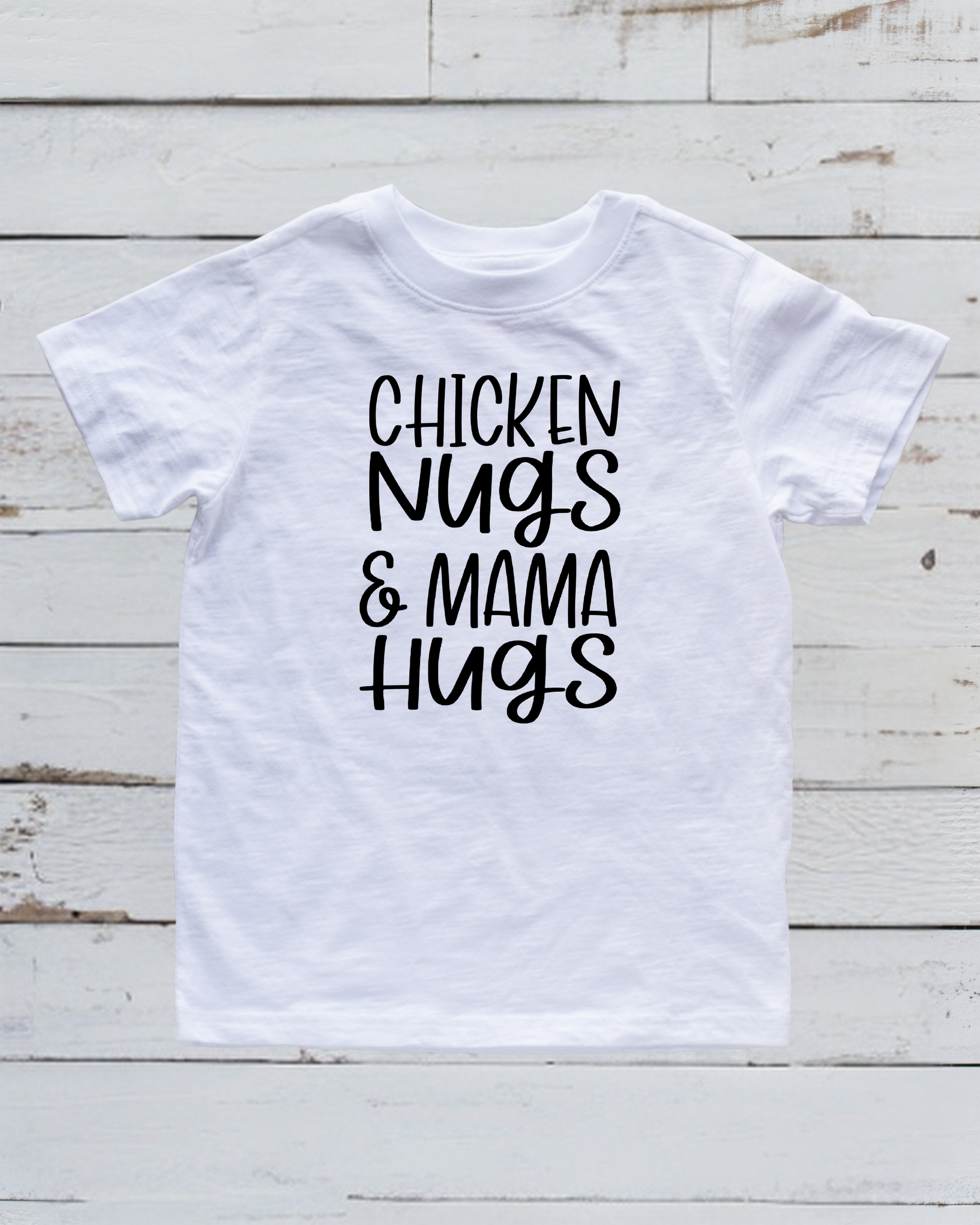 We've cooked up something extra special for your mini-me that's as cheeky and charming as they are. Picture this: your kiddo rocking a tee that says "Chicken Nugs and Mama Hugs" – because let's face it, that's the recipe for a perfect day, am I right?