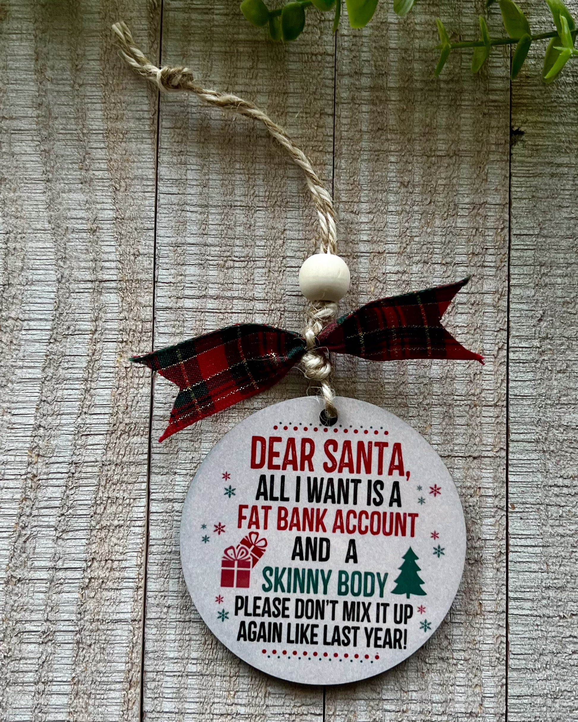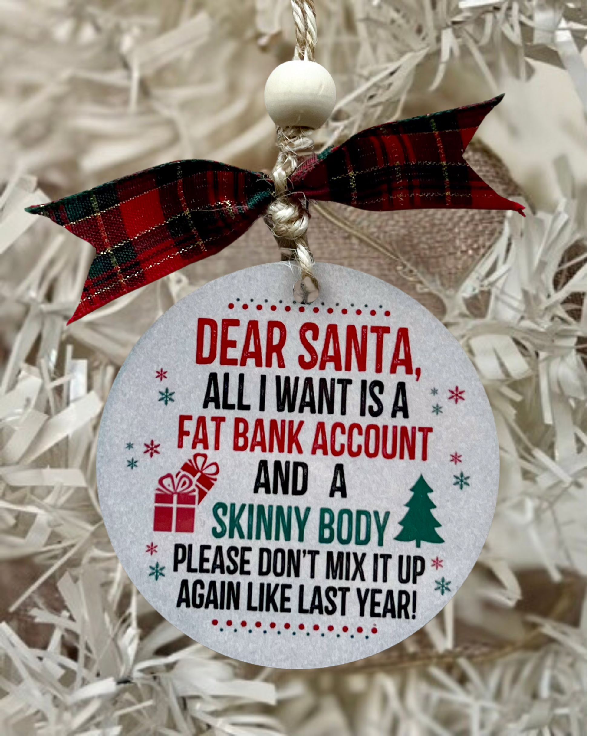 dear santa, all I want is a fat bank account and a skinny body please don't mix it up again like last year | christmas ornament