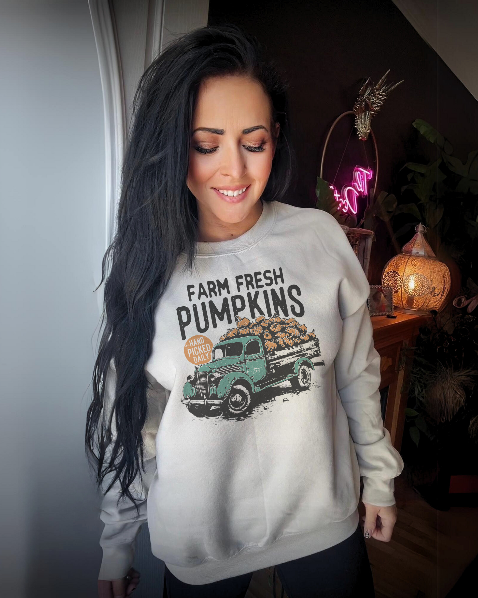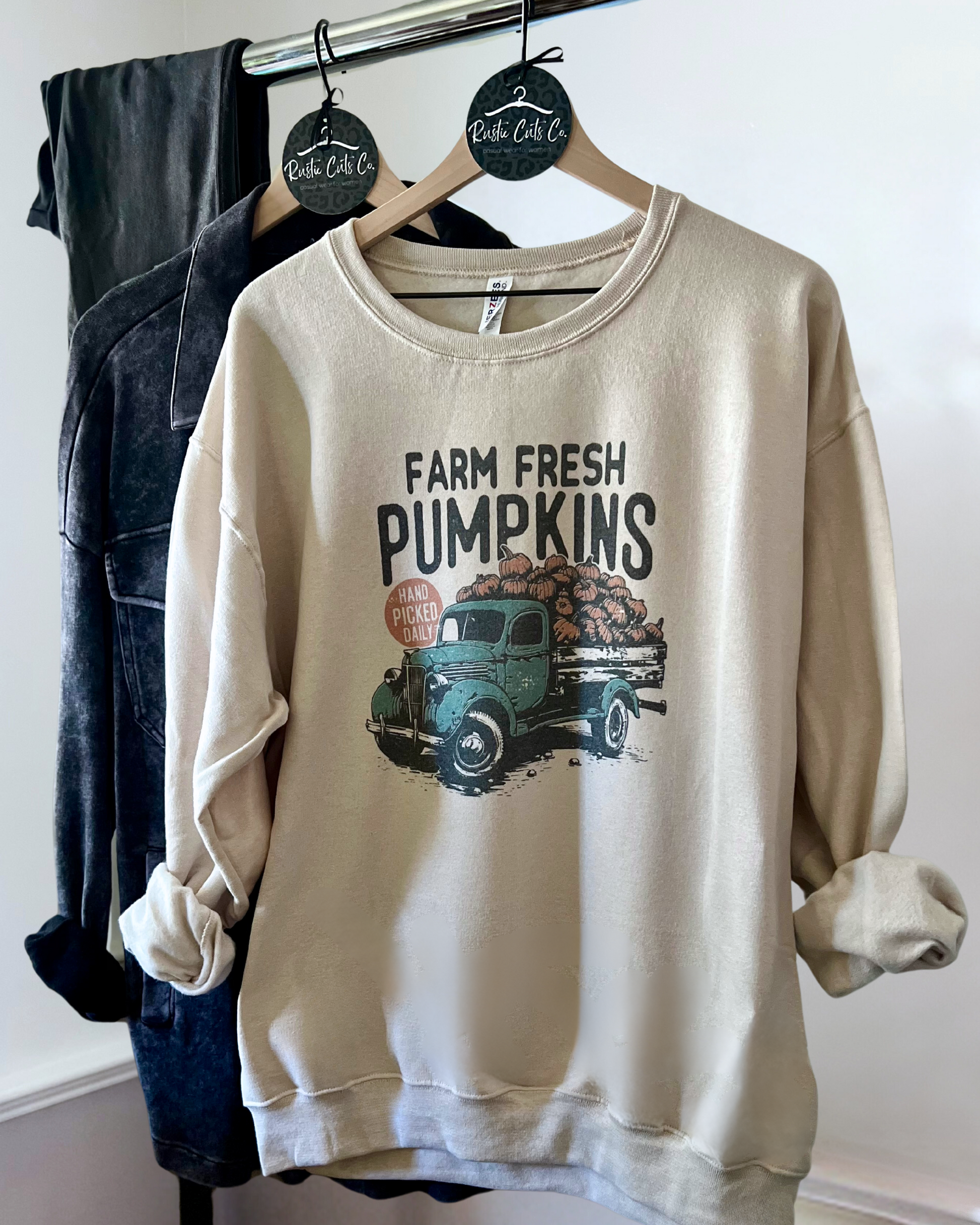 Ready to vibe with the ultimate fall look? Our "Farm Fresh Pumpkins" sweatshirt is serving up all the cozy, autumn feels with a side of vintage charm.