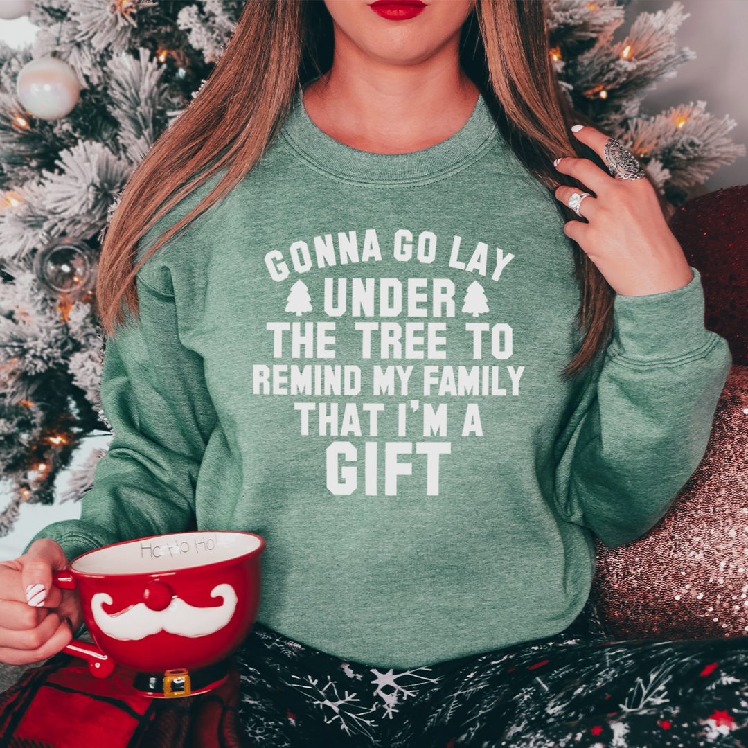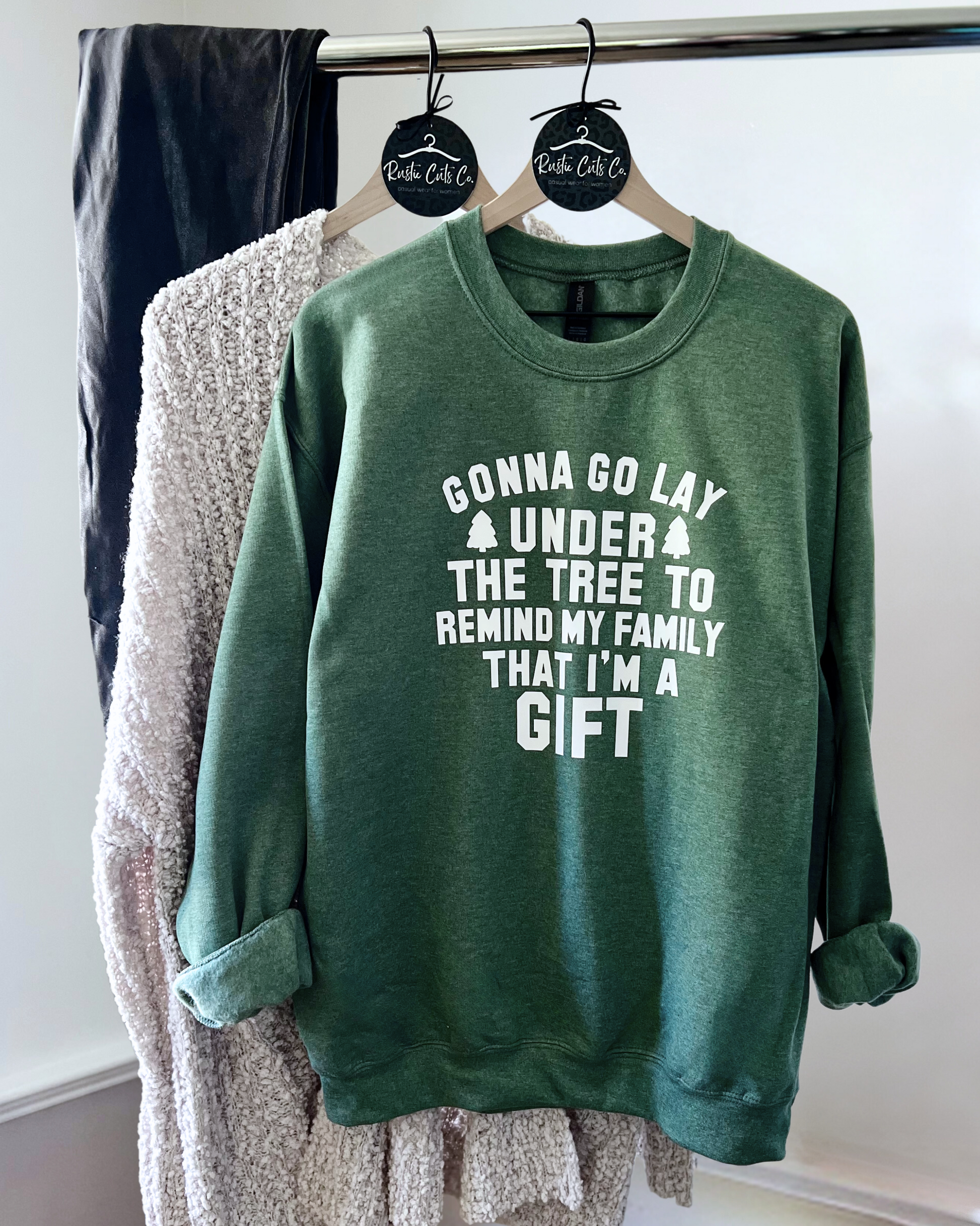 Feeling like the best gift your family could ask for? Same! Our comfy sweatshirt, featuring the graphic "gonna go lay under the tree to remind my family I’m a gift," is perfect for those days when you want to look cute without actually having to move.