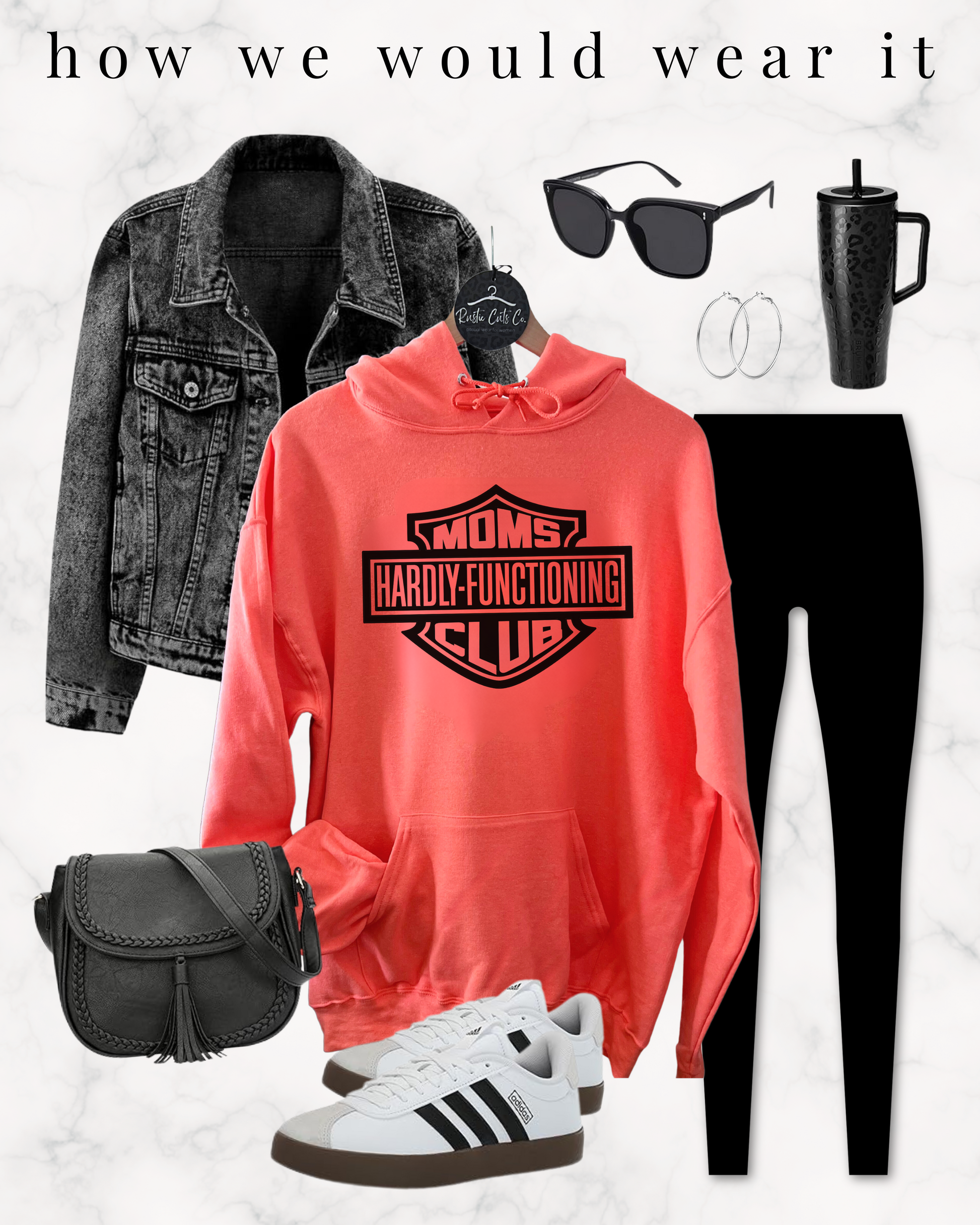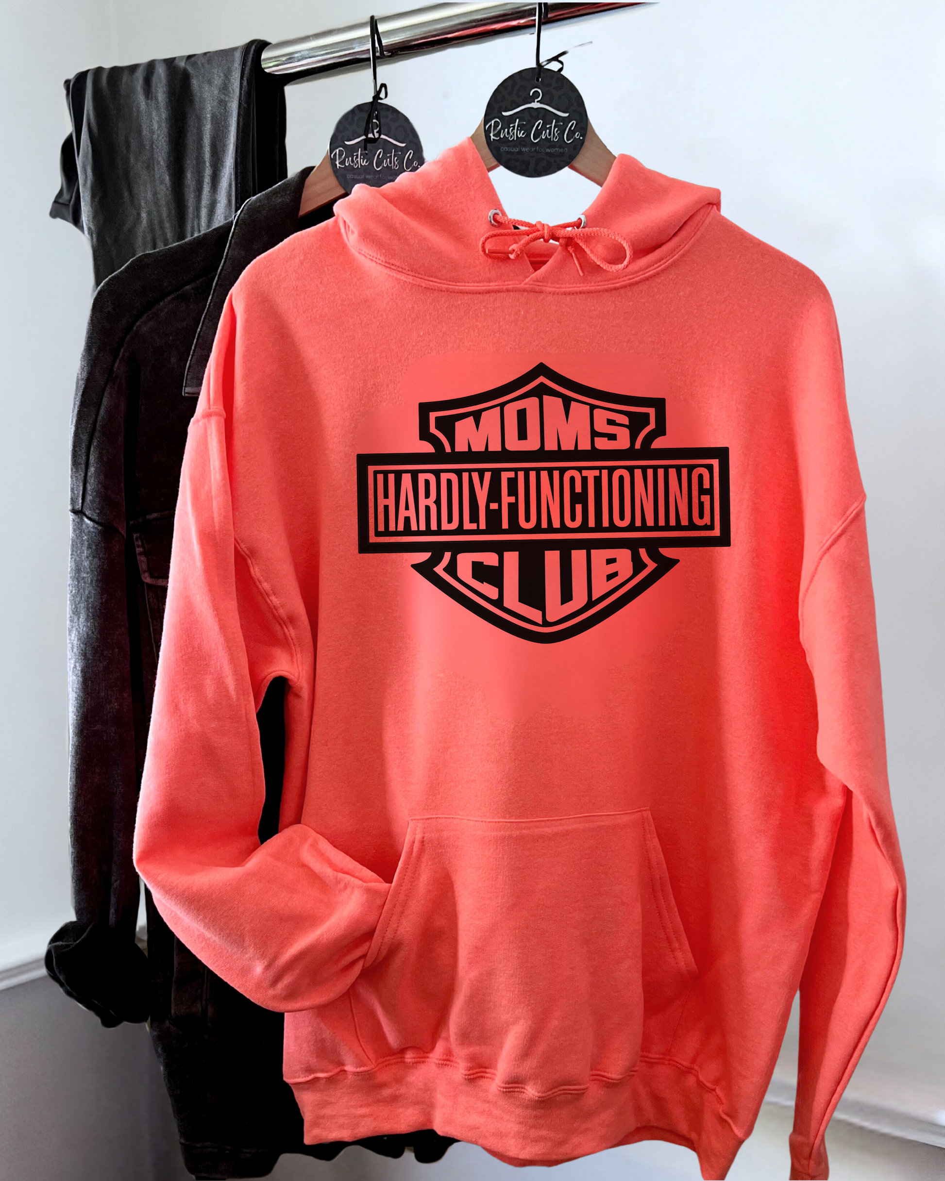 Welcome to the Hardly Functioning Moms Club—where the coffee’s cold, the to-do list never ends, and the vibes are still on point. This sweatshirt is the ultimate mood for every mom who’s keeping it together… kinda.