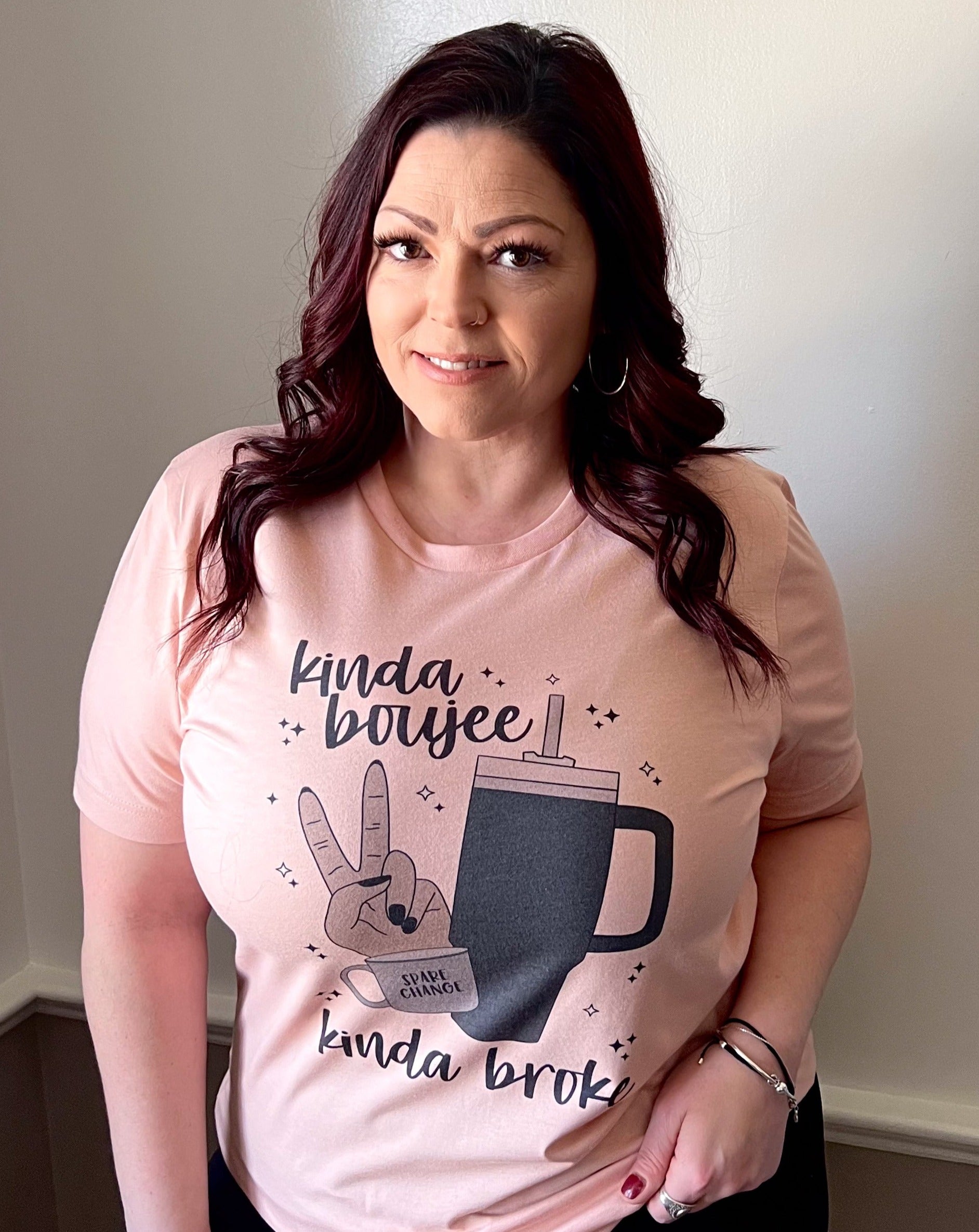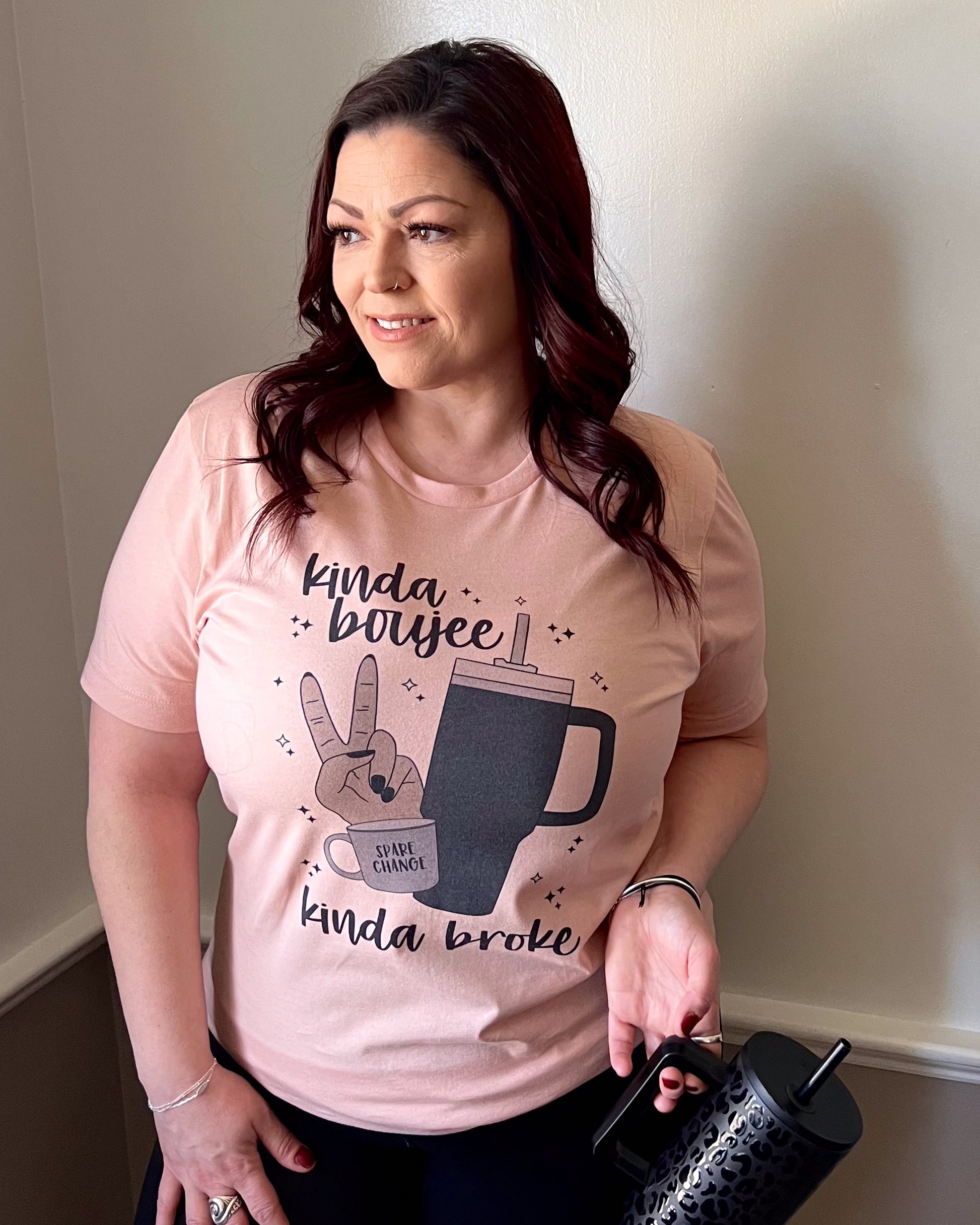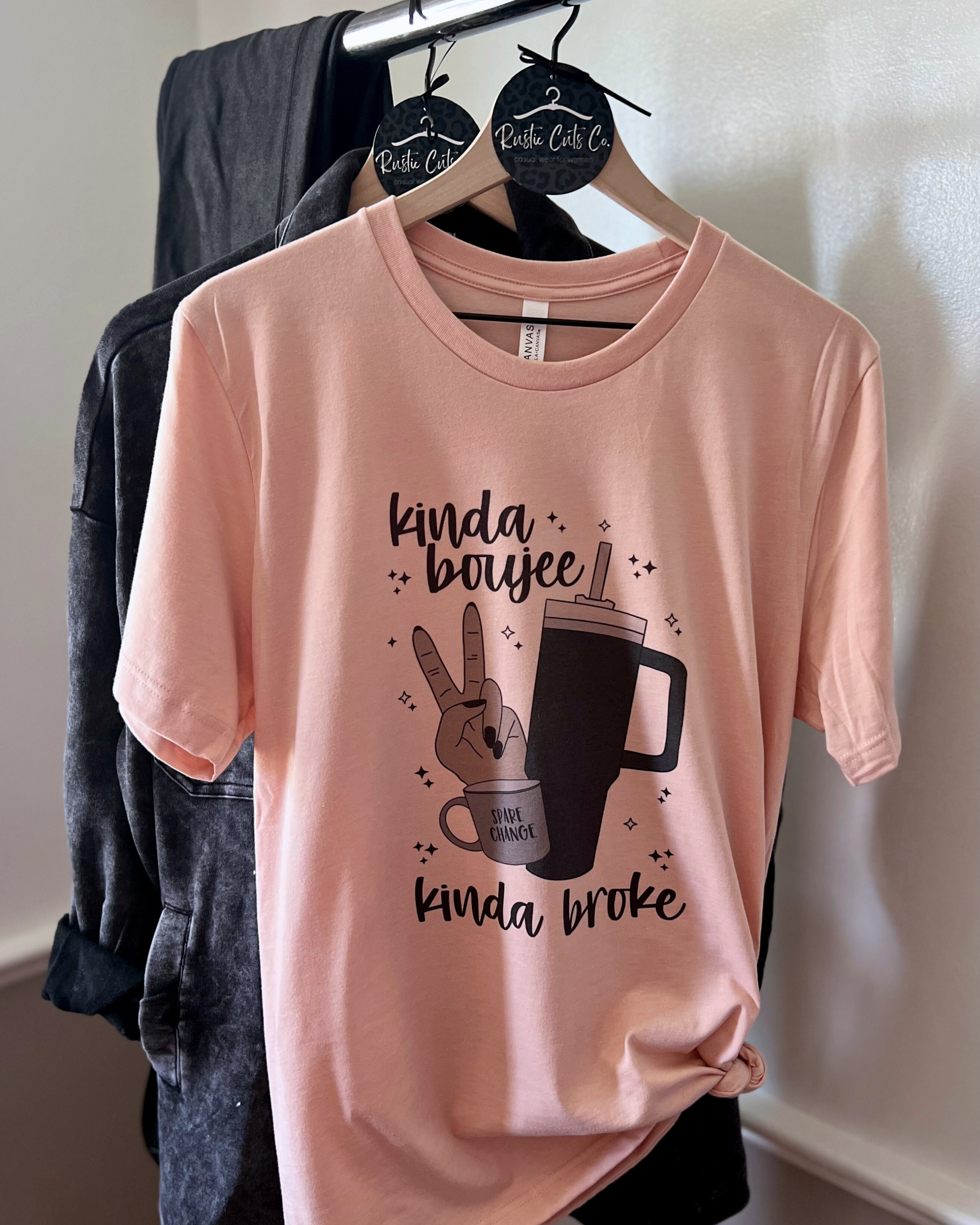 So, whether you're sipping your latte from a fancy mug or saving those pennies for a rainy day, this tee is your ultimate style statement. Let the world know that you're living that "kinda boujee, kinda broke" life – and loving every minute of it!