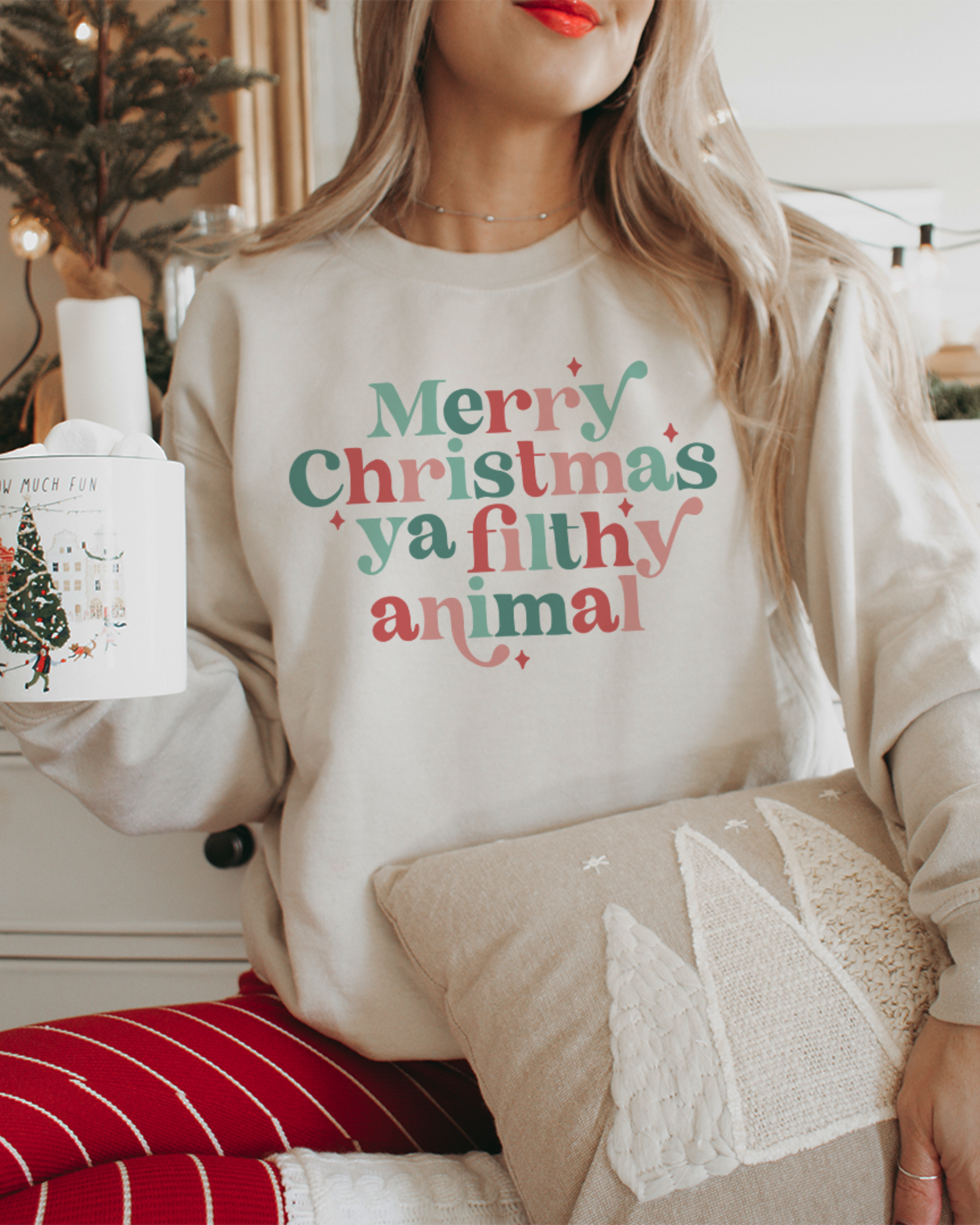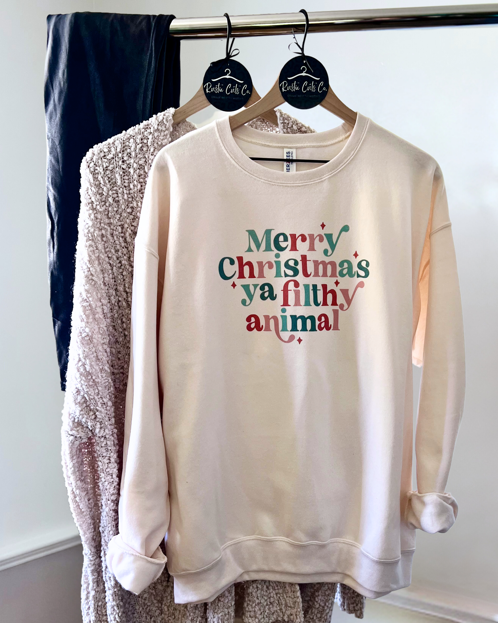 Hey there, holiday queens! Ready to slay the cozy game this season? Our handmade sweatshirt featuring the classic line "Merry Christmas, ya filthy animal!" is here to make you feel comfy and fabulous—because who says you can’t look cute while quoting your favorite holiday movie?