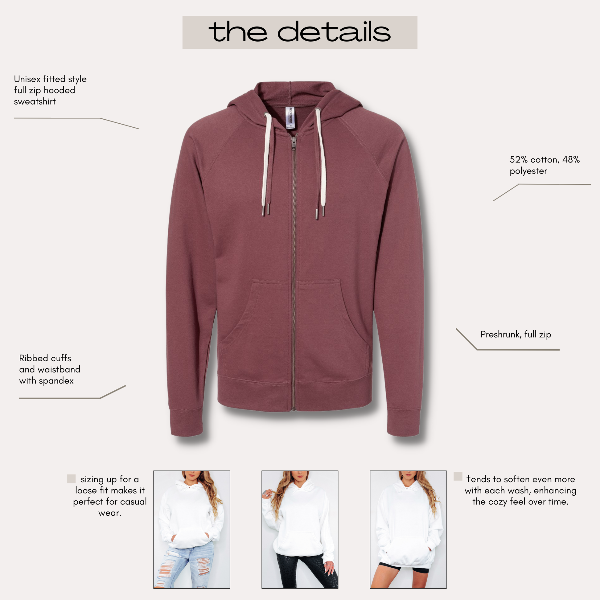 This zip up hooded sweatshirt is a must have for all the professional over thinkers. Cozy, comfortable, and a closet staple all year round. This is a laid-back style you need in your life. For days at home, pair it with sweatpants and say hello to comfort heaven.