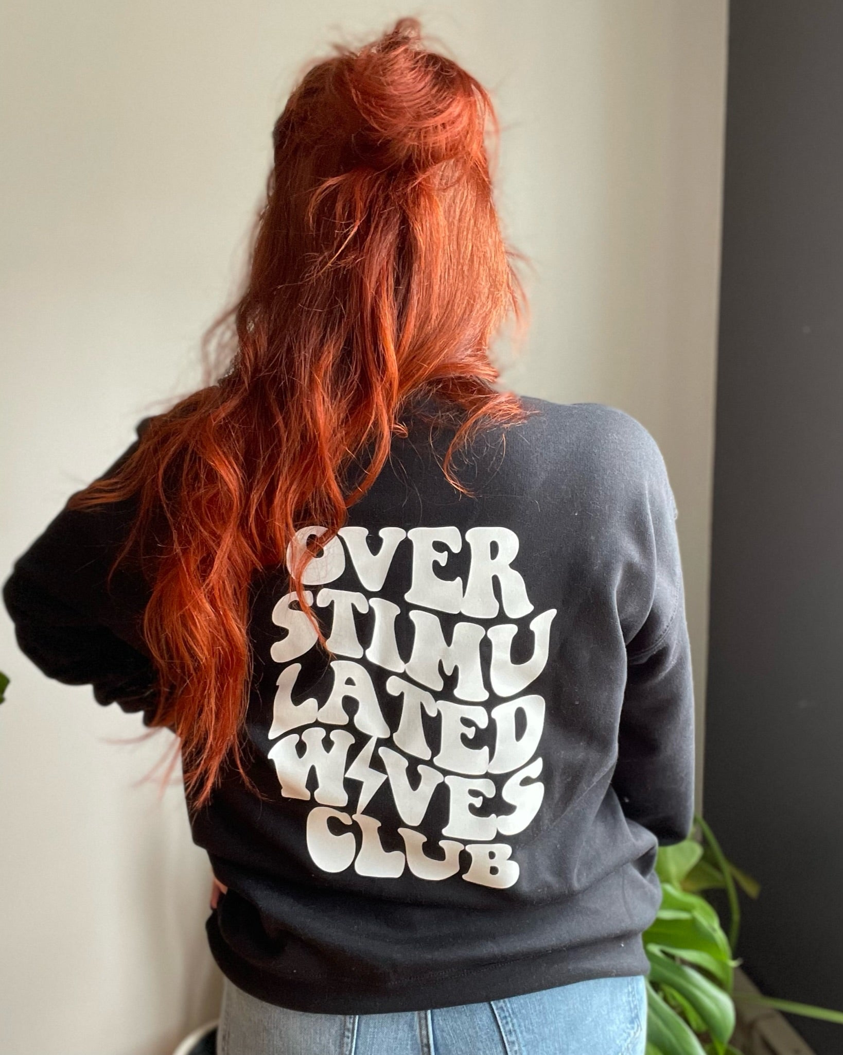 Introducing the "Overstimulated Wives Club" sweatshirt – the ultimate sweatshirt for all you badass wives out there. This sweatshirt is perfect for when you need to take a breather from your hectic schedule. So go ahead, put this sweatshirt on, grab a cup of coffee (or wine, we don't judge), and take on the world like the queen that you are. You got this!
