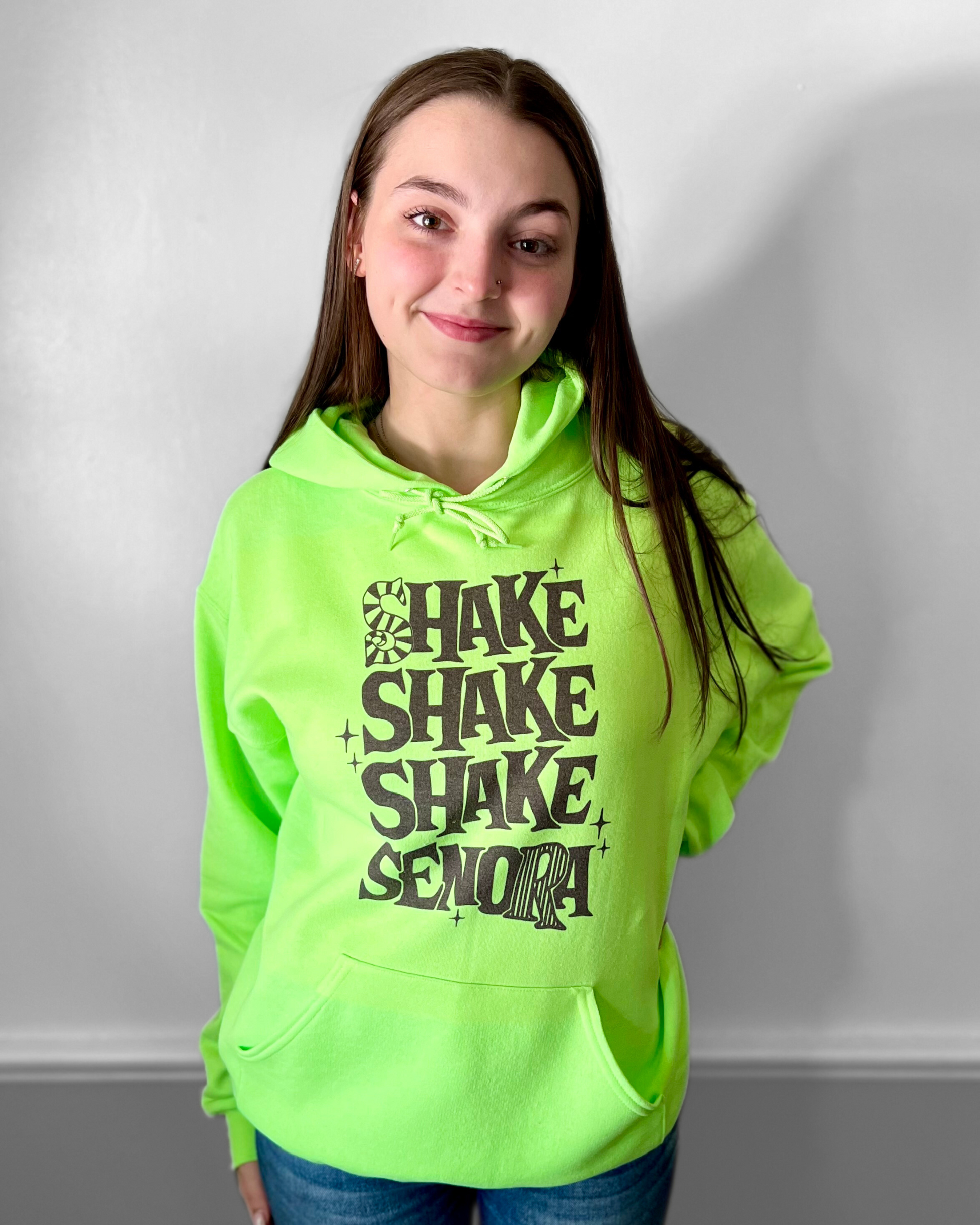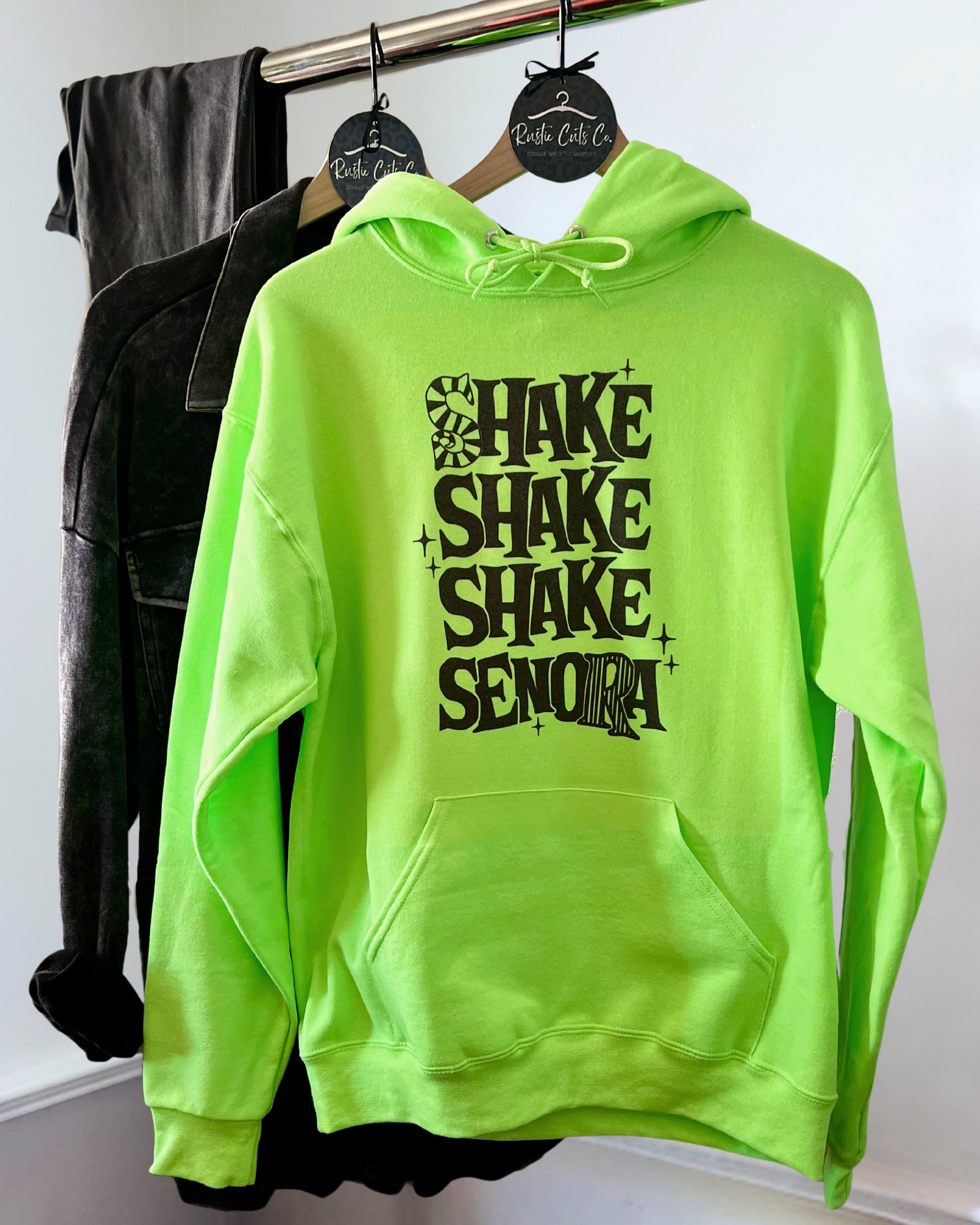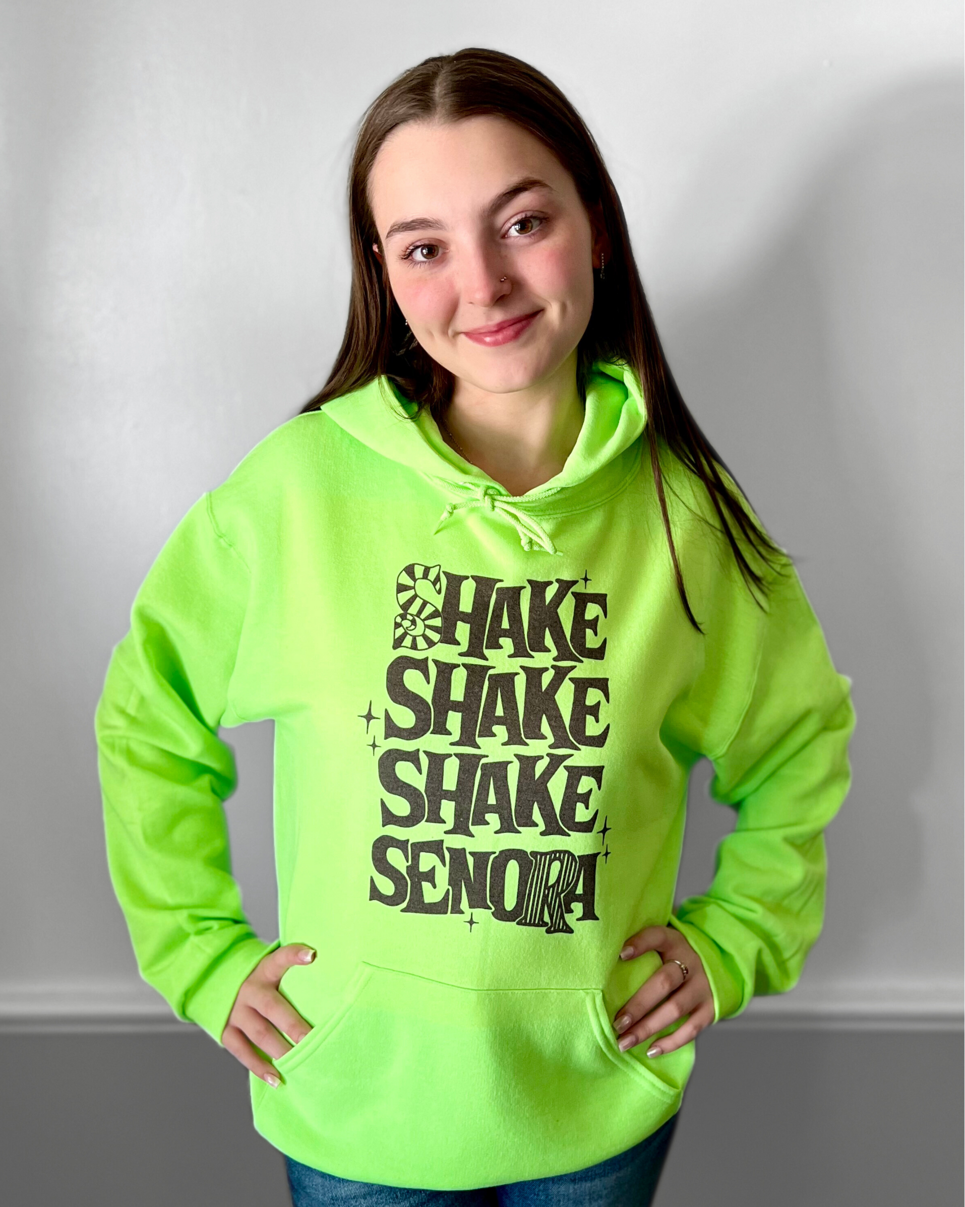 Get ready to turn your fall vibes up to 11 with our newest graphic sweatshirt. Our “Shake Shake Shake Senora” design is here to bring a touch of magic to your Halloween season.