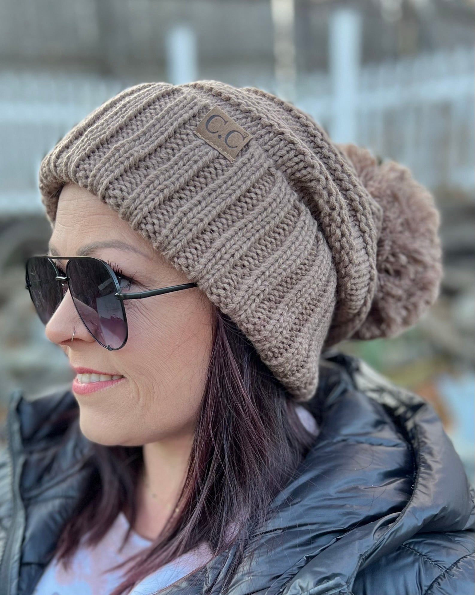 DETAILS: slouchy style, ribbed knit, yarn pom pom in the color Taupe
