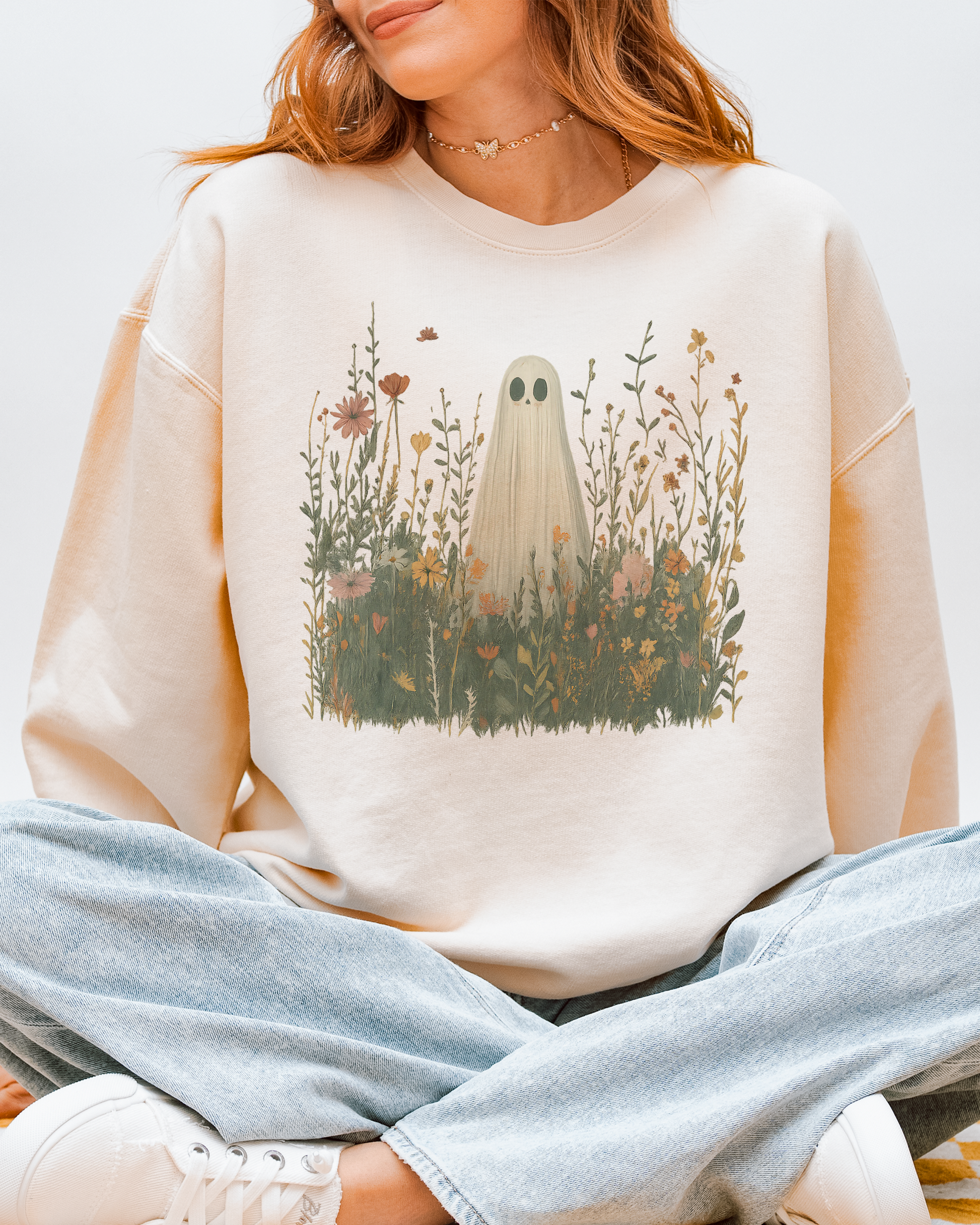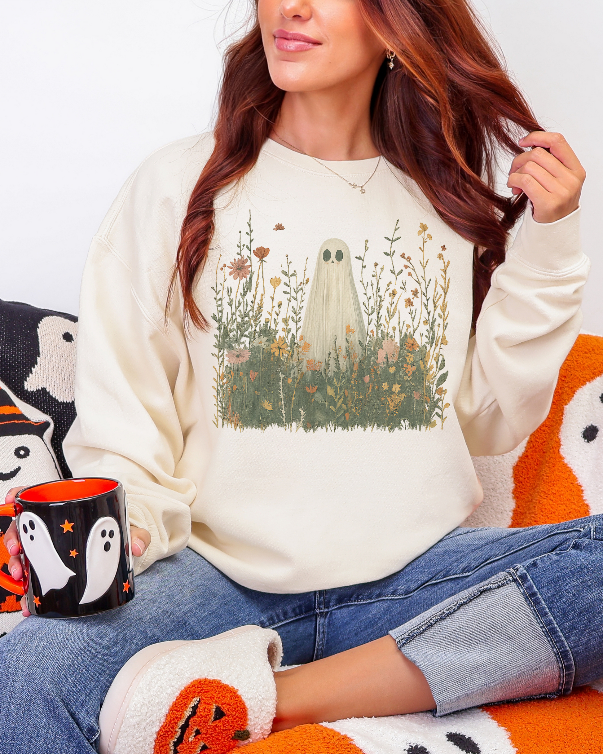 Soft, comfy, and just a little whimsical, this sweatshirt makes everyday chaos feel a lot cuter. The ghost-in-the-wildflowers vibe is equal parts sweet and spooky, perfect for coffee runs, errand days, and curling up at home. Effortless, cozy, and totally wearable on repeat.